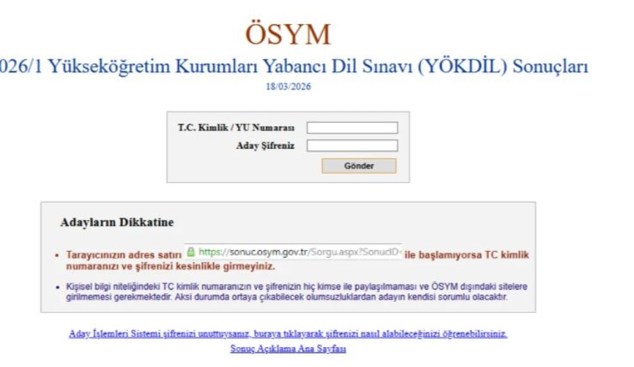 Sınava giren adaylar, 18 Mart 2026 günü saat 14.30'dan itibaren sonuçlarına ulaşmaya başladı. Adaylar, ÖSYM’nin resmi internet adresi olan "sonuc.osym.gov.tr" üzerinden T.C. kimlik numaraları ve kişisel şifrelerini kullanarak sınav başarı durumlarını görüntüleyebiliyor. Dijital ortamda paylaşılan bu sonuçlar, adaylar için resmi tebliğ niteliği taşıyor.